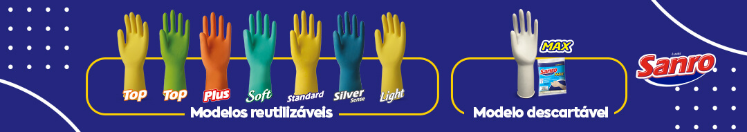 Legenda: Luva Sanro Fit, confeccionada em látex natural, interior liso e palma antiderrapante.
